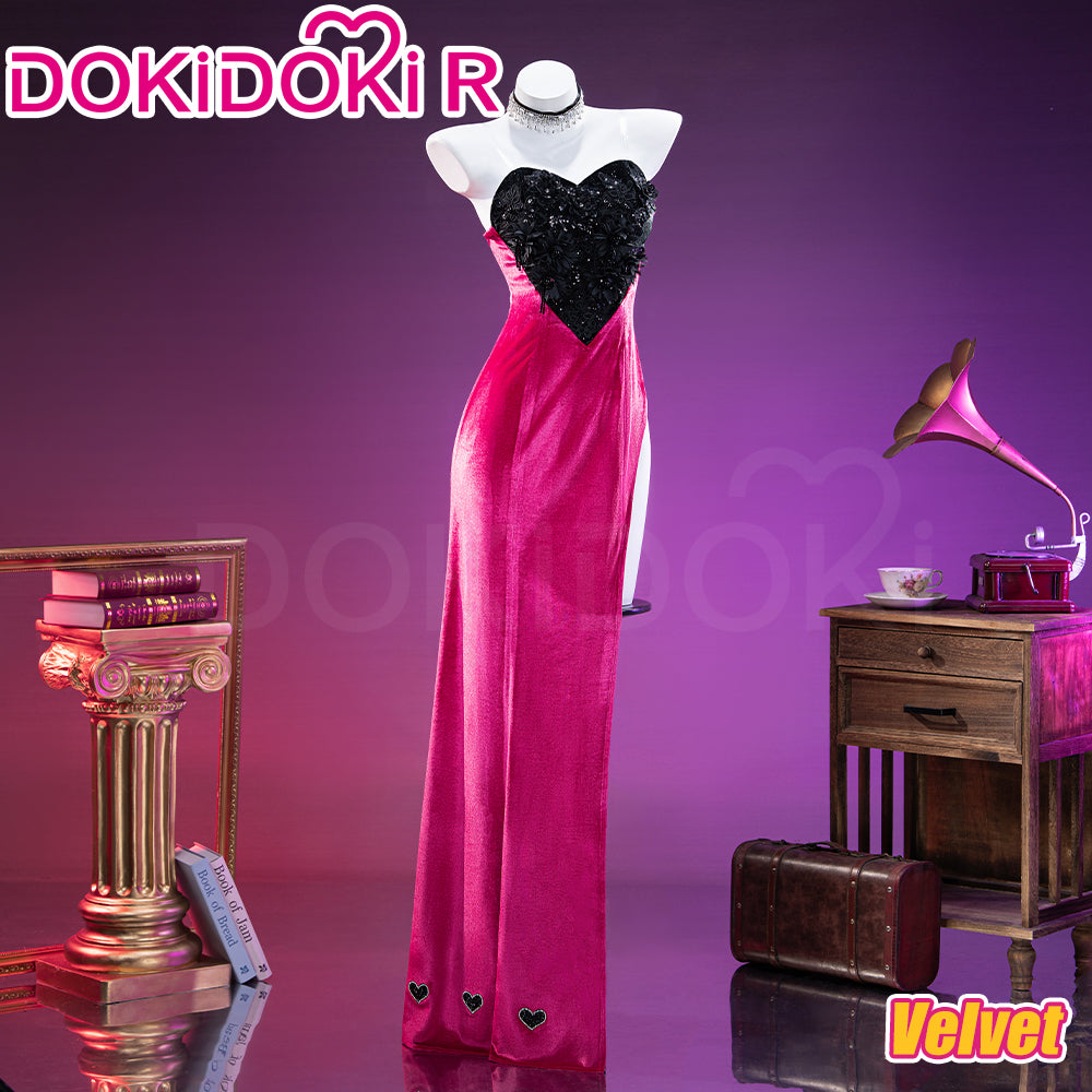 4.The velvet version has a patterned velvet bustier and velvet skirt.